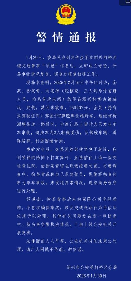 1月29日,我局关注到网传金某在绍兴柯桥涉嫌交通肇事“顶包”信息后,立即成立专班,开展事故情况复查、调查过程复核等工作。